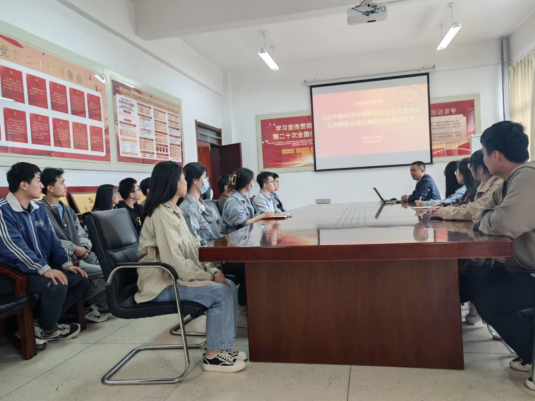 5月10日,学院党委副书记贾海波以“习近平新时代中国特色社会主义思想是党和国家必须长期坚持的指导思想”为题,在工科一号楼203党团会议室为所在的学生自组织党支部讲授主题教育专题党课,支部全体党员参加听课。