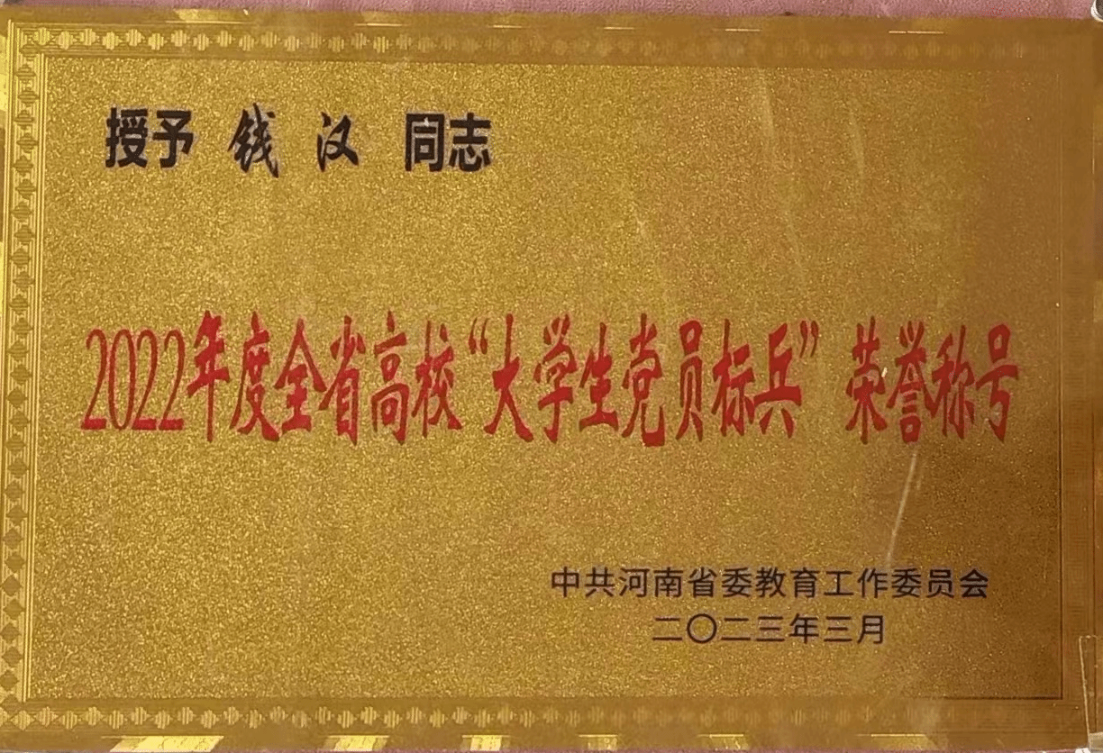 2019级本科生钱汉同学荣获全省高校“大学生党员标兵”称号。