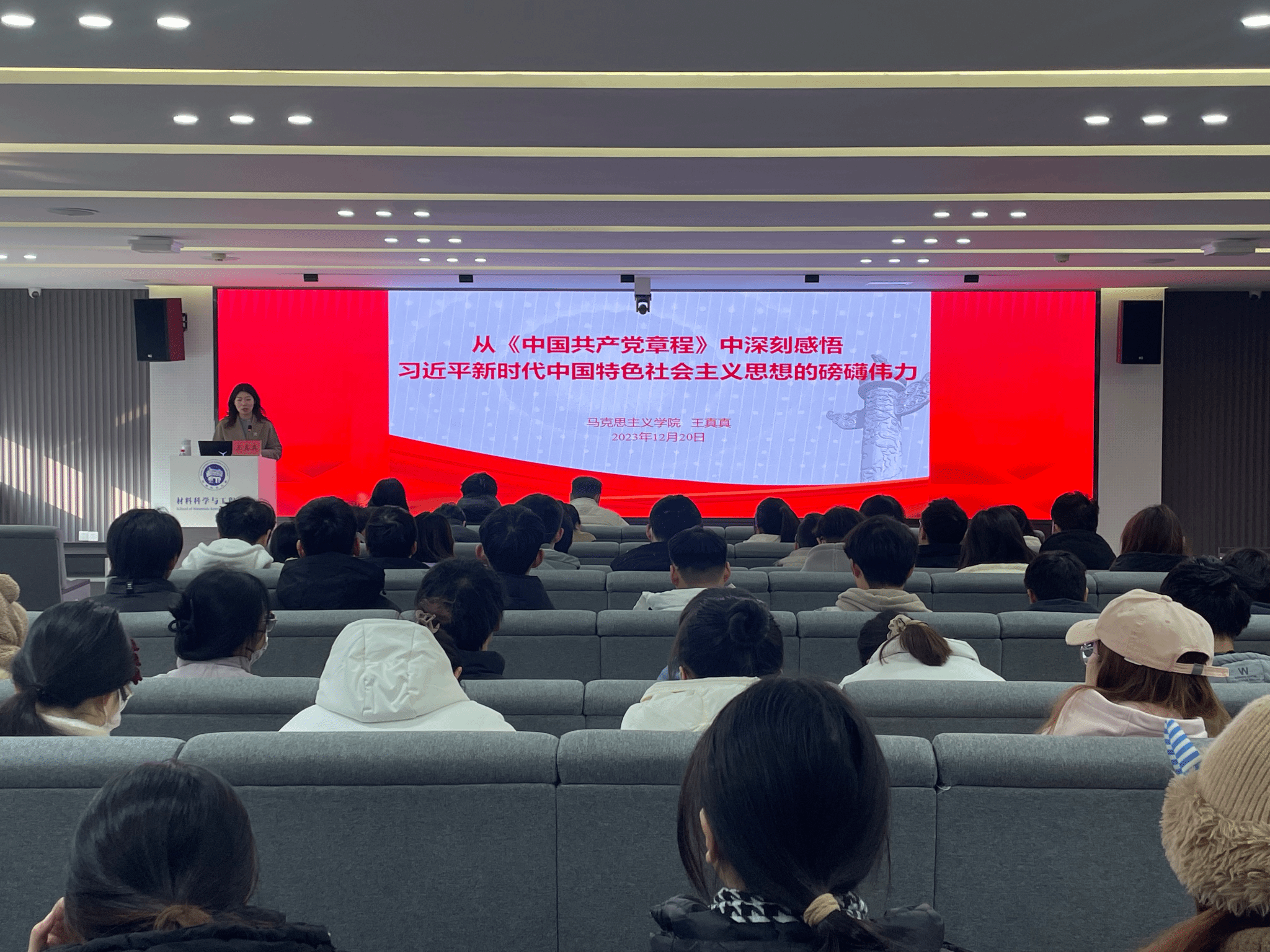 党委在工科一号楼5059学术报告厅举办2023年“理论讲堂”专题讲座,邀请马克思主义学院教师王真真以《从党章中深刻感悟习近平新时代中国特色社会主义思想的磅礴伟力》为题,为学院师生做专题讲座。