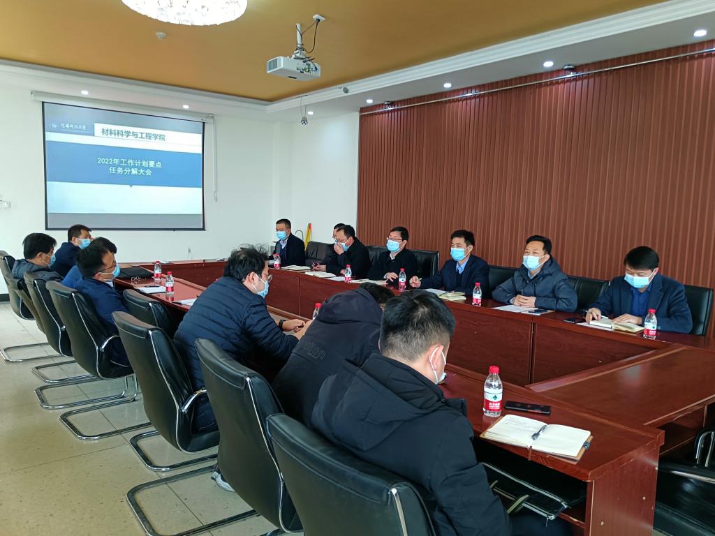 为科学谋划、扎实开展2022年工作, 积极推进材料科学与工程“一流学科”建设, 3月23日, 学院在工1-261会议室召开2022年度工作会议,学院全体领导班子、各教工党支部书记、系主任、实验室主任、科研平台负责人参加会议,会议由副院长郭俊卿主持。