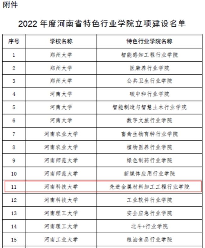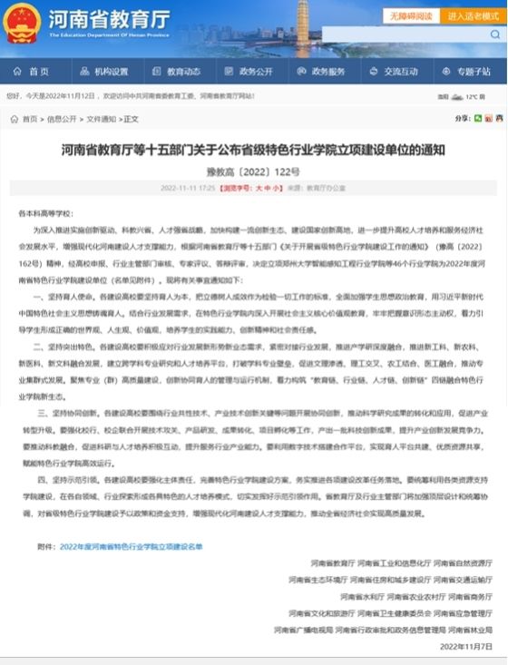 河南省特色行业学院项目是河南省教育厅为了深入贯彻落实省委省政府“创新驱动、科教兴省、人才强省”战略,加快构建一流创新生态、建设国家创新高地,进一步提升高校人才培养和服务经济社会发展水平,增强现代化河南建设人才支撑能力,根据河南省政府办公厅《关于提升高校科技创新能力的实施意见》,组织开展的省级特色行业学院建设项目。特色行业学院主要聚焦行业共性技术和转型发展需求,积极推动高校与地方政府、行业部门、行业协会等合作共建,努力打造融人才培养、科学研究、技术创新、企业服务、学生创业等功能于一体的示范性人才培养实体。所有申报的建设方案经过了行业主管部门的审核、专家的评议与答辩等,最终有46个项目获批立项建设。