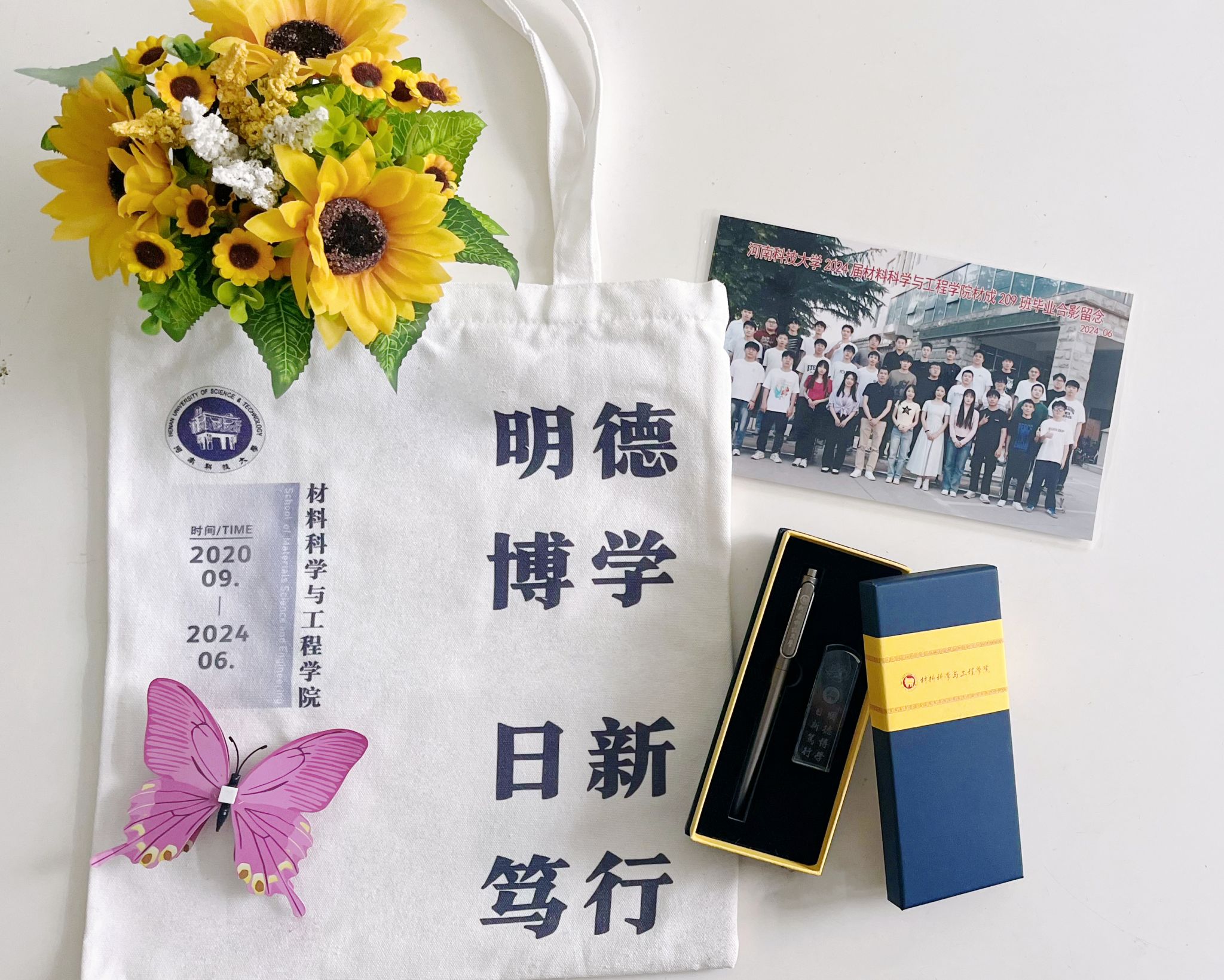 学院精心准备的毕业纪念品由水晶纪念章、定制手提袋和毕业纪念照组成。纪念品融合了毕业生的姓名、校徽、校训、时间等元素,希望毕业生们不忘在河科大求学的四年时光,牢记“明德博学,日新笃行”的校训,带着母校的期望、老师的教诲、朋友的鼓励,砥砺前行,奋力为中国式现代化挺膺担当。