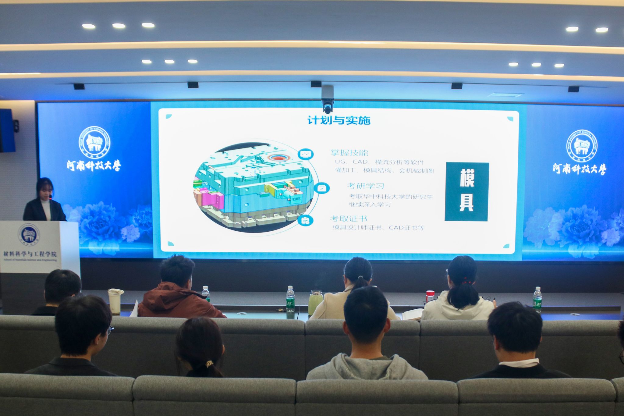 在工科1号楼5059报告厅举办第二届大学生职业规划大赛。就业工作办公室主任李芳、团委书记姚占杨、学生工作办公室副主任张欣、团委副书记许傲和李帅龙担任此次比赛评委。