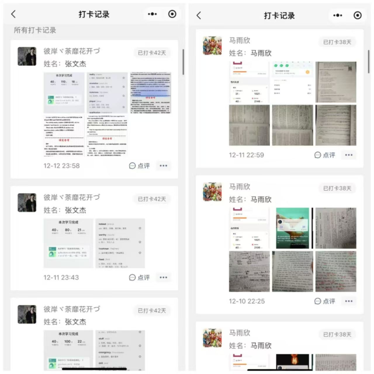 打卡活动旨在通过真题打卡和单词记忆,帮助同学们巩固知识,提升应试能力,减轻备考压力。在活动过程中,参与打卡的同学每日利用碎片时间通过应用百词斩、网易有道词典等app进行打卡或者以手写的方式积累词汇,并拍照或截图在小程序上上传自己的学习进程,即为打卡成功。打卡活动于10月31日开启,累计参与人数218人,累计打卡3514次,这一系列的数据和成果,不仅是对同学们学习成果的肯定,更是对积极学习态度和持之以恒精神的生动体现。
