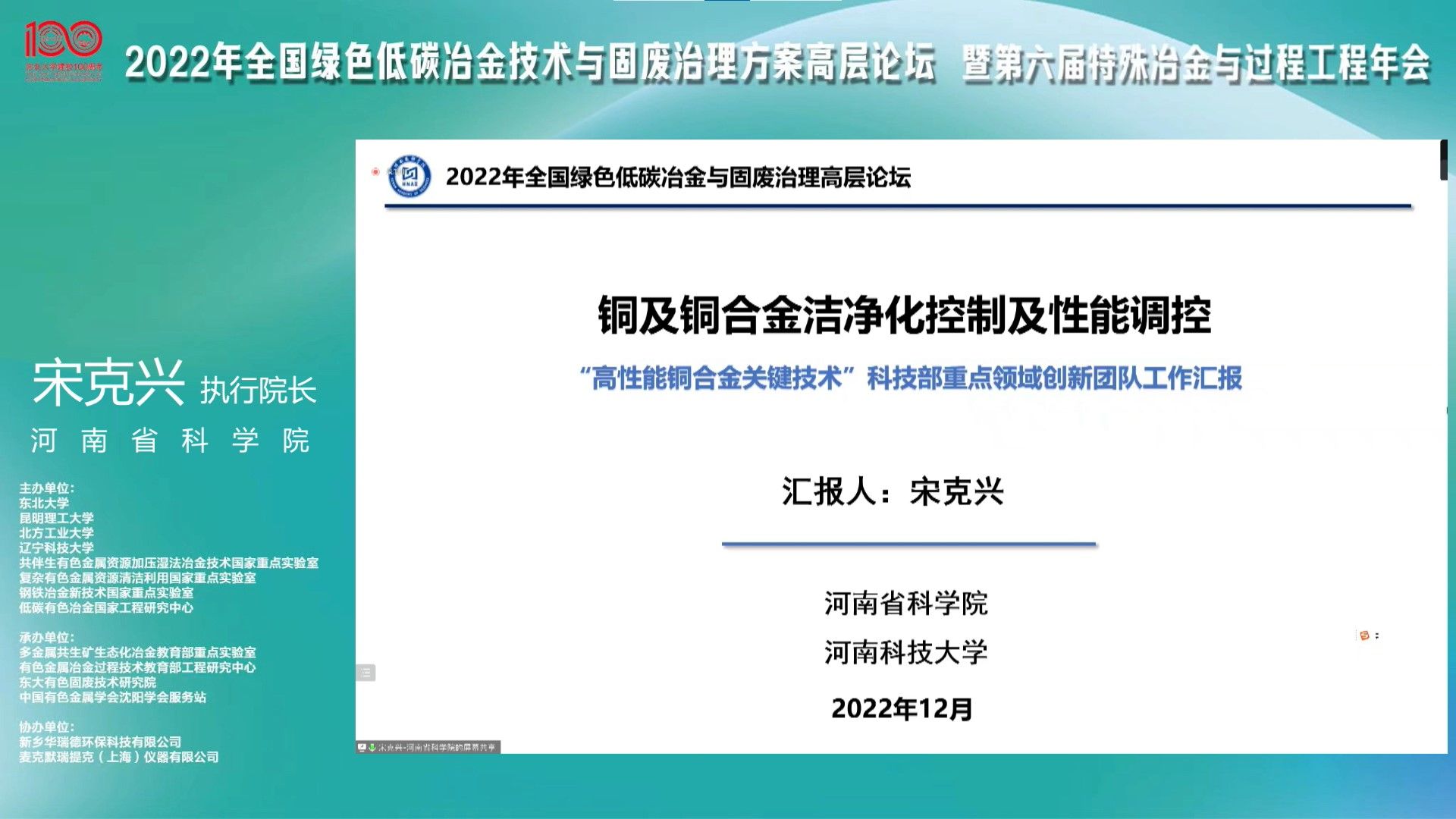 12月16日至18日,由东北大学、昆明理工大学、复杂有色金属资源清洁利用国家重点实验室、钢铁冶金新技术国家重点实验室和低碳有色冶金国家工程研究中心等联合主办的2022年全国绿色低碳冶金技术与固废治理方案高层论坛暨第六届特殊冶金与过程工程年会在东北大学云端成功举办。中国工程院何季麟、王国栋、黄小卫、冯夏庭、柴立元、姜涛等院士以及来自全国高校、科研院所、冶金相关知名企业的300余名专家、学者、领导出席大会。作为本次大会主要支持单位之一,二次元